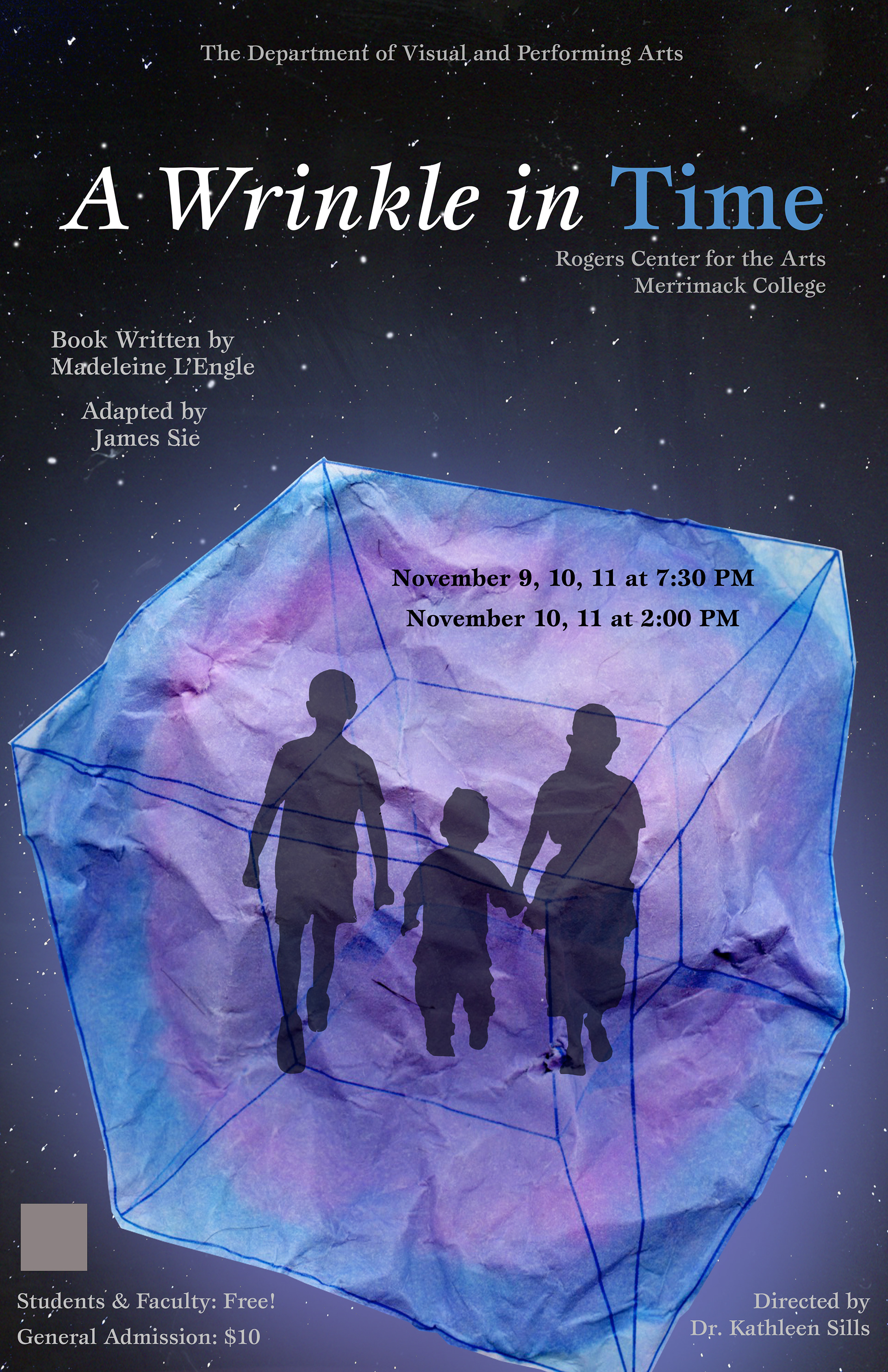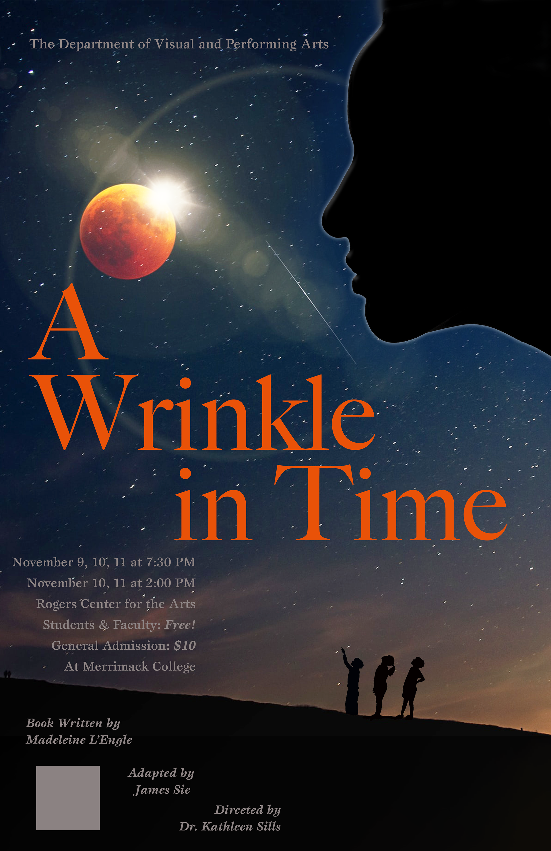 In this Project for my Visual Storytelling class, I got to design a couple of conceptual posters for Merrimack College's performance of the play, “A Wrinkle in Time". For the first poster, we were only allowed to use Photoshop, and for the other, we had to make one by hand or with a combination of both. To get the otherworldly feel that the director was looking for, I found an image of the moon, colored it orange, and added a lens flare to make it stand out a little bit more.